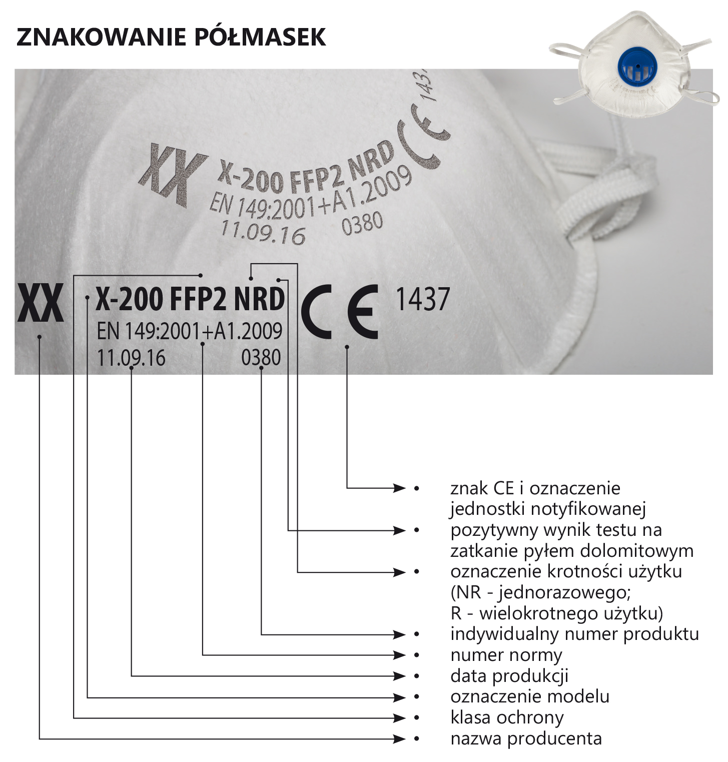 EN149 - Sprzęt ochrony układu oddechowego - Półmaski filtrujące do ochrony przed cząstkami - Wymagania, badanie, znakowanie. Podano minimalne wymagania dotyczące półmasek filtrujących, stosowanych jako sprzęt chroniący układ oddechowy przed cząstkami, z wyjątkiem tych masek, których używa się w razie konieczności ucieczki. Opisano badania laboratoryjne umożliwiające ocenę zgodności półmasek filtrujących z wymaganiami.