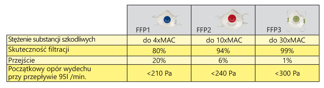 Półmaski filtrujące dzieli się według skuteczności filtrowania na trzy klasy: FFP1, FFP2, FFP3.