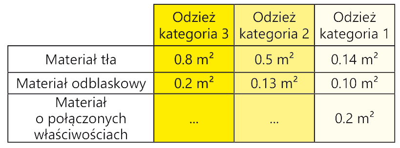 Norma utrzymuje podział odzieży na 3 kategorie na podstawie minimalnych powierzchni materiałów odblaskowych danych w m², przy czym kategoria 1 jest najniższą kategorią, a kategoria 3 przedstawia najwyższy poziom widoczności.
